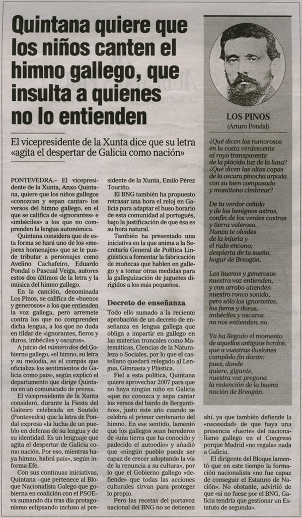 Mariano Rajoy considerou así intranscendente a posibilidade de que rapaces aprendan o himno nas escolas, idea que na súa opinión "non lle importa a ninguén". Así, Rajoy destacou o inglés e as novas tecnoloxías como prioridades que lles "permitirán aos nenos triunfar na vida e que o seu país mellore". Paradoxalmente, esta mesma semana, desde a dirección do PPdeG, o vicesecretario xeral da formación, Diego Calvo, aínda comentando que o executivo debera fixarse noutras prioridades, recoñecía ao igual que o vicepresidente da Xunta, Anxo Quintana, que o PPdeG considera que o himno "debe ser coñecido por todos".